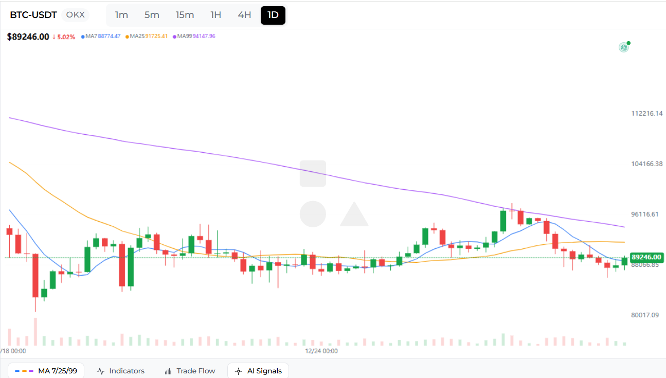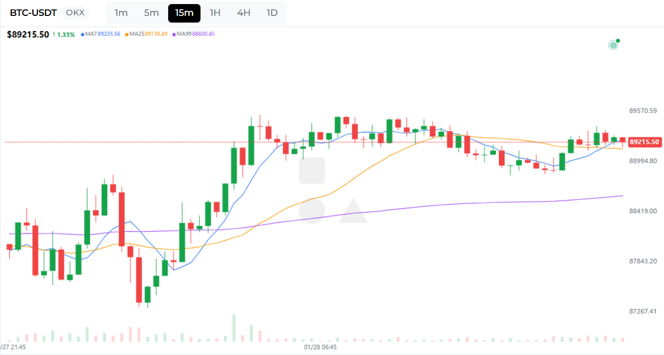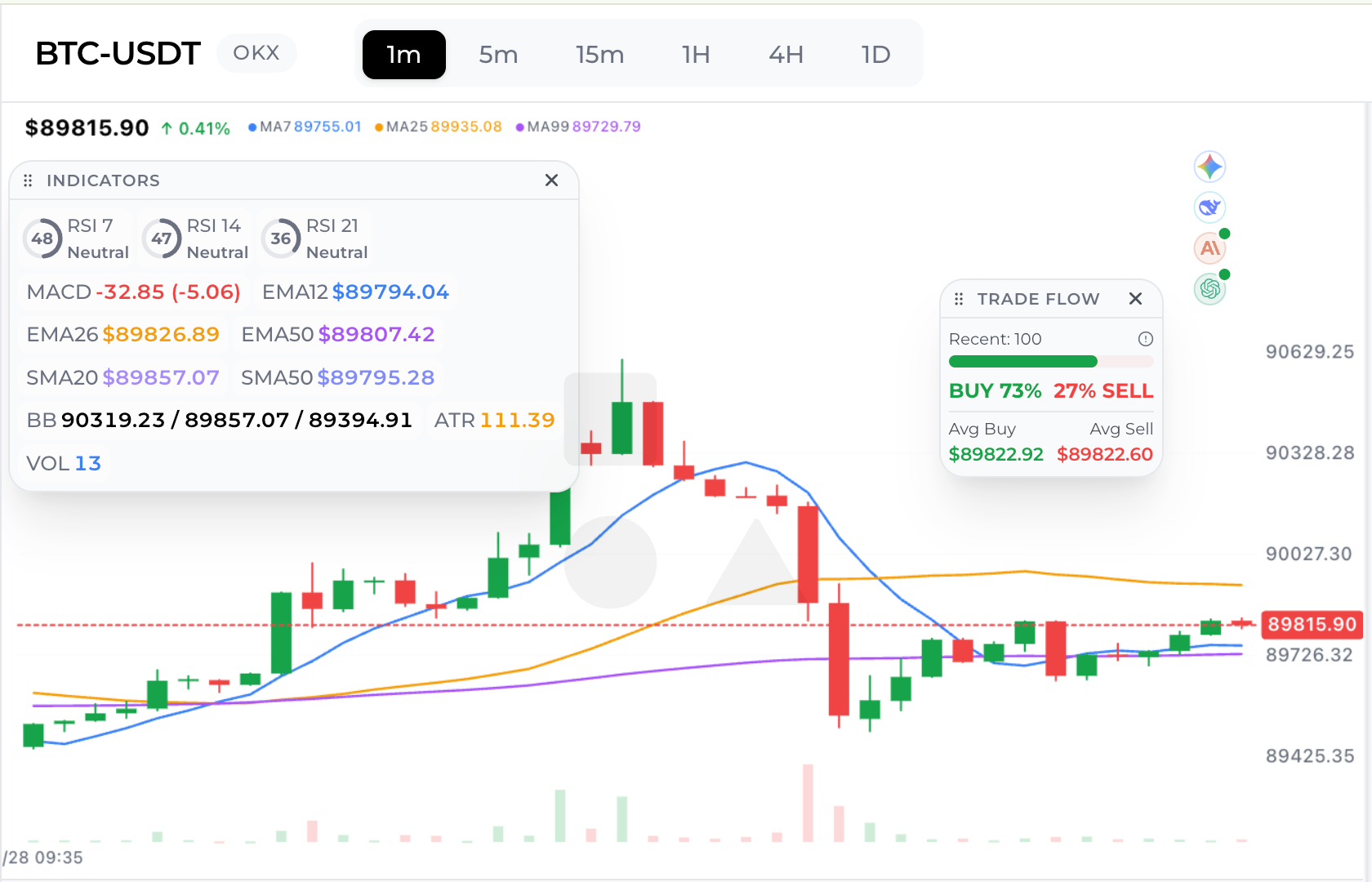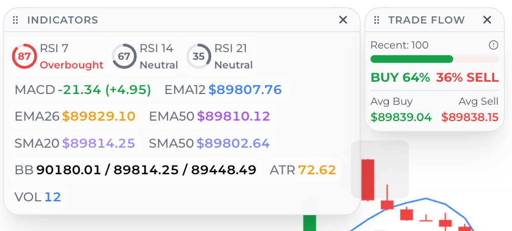 中央のチャートエリアはマルチタイムフレーム暗号取引(1m/5m/15m/1h/4h/1d)用に構築されています。タイムフレームの切り替えは瞬時に行われるため、動きがマイクロバースト、日中のスイング、または高タイムフレームのレジームシフトのいずれであるかを確認できます。